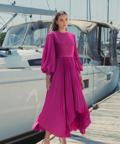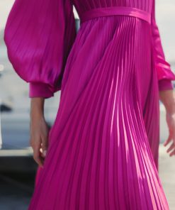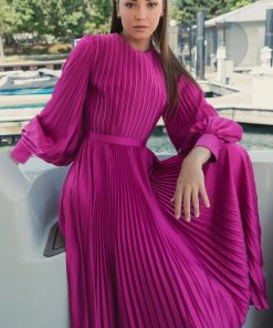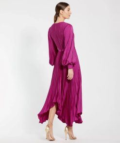 Embrace timeless elegance in this stunning handkerchief dress. Crafted from pleated satin fabric, this dress features a high neckline and long cuffed sleeves, making it the perfect wedding guest or cocktail party dress.