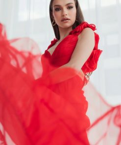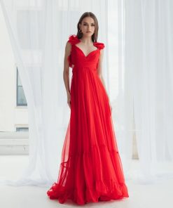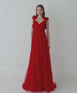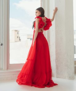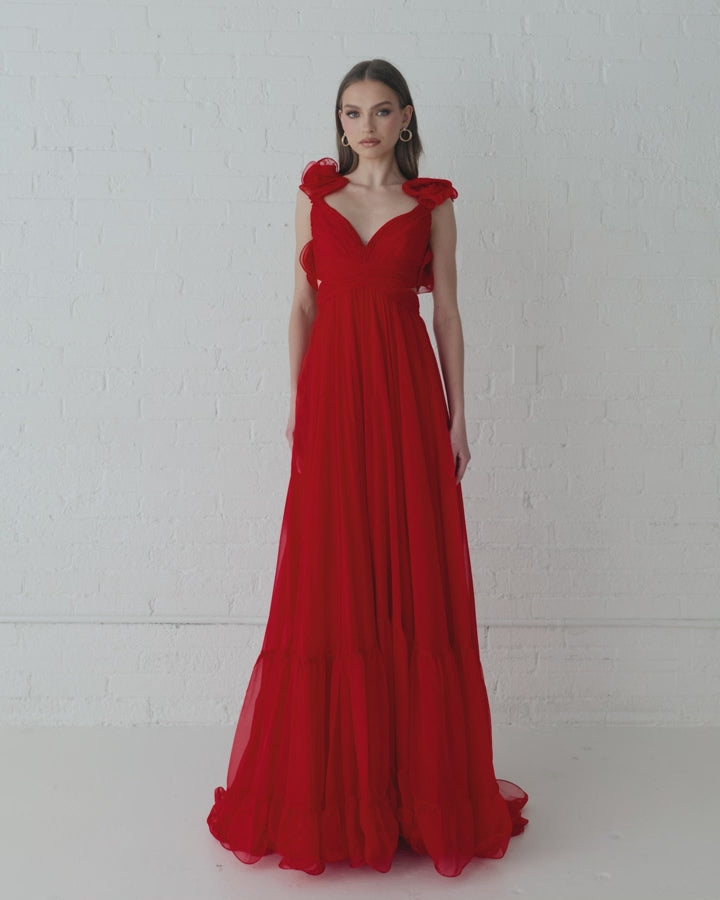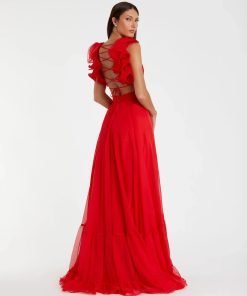The Mac Duggal Iconic Ruffle Gown. Floor length tiered gown with daring side cutouts, a lace-up back, and dramatic ruffles at the shoulder. This best selling silhouette is flattering on most body types and easily adjustable for the best fit.