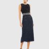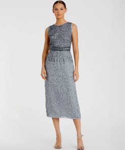 Elegant vertical-sequined sleeveless midi sheath dress with a flattering hand- beaded waist and back vent slit.