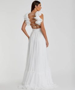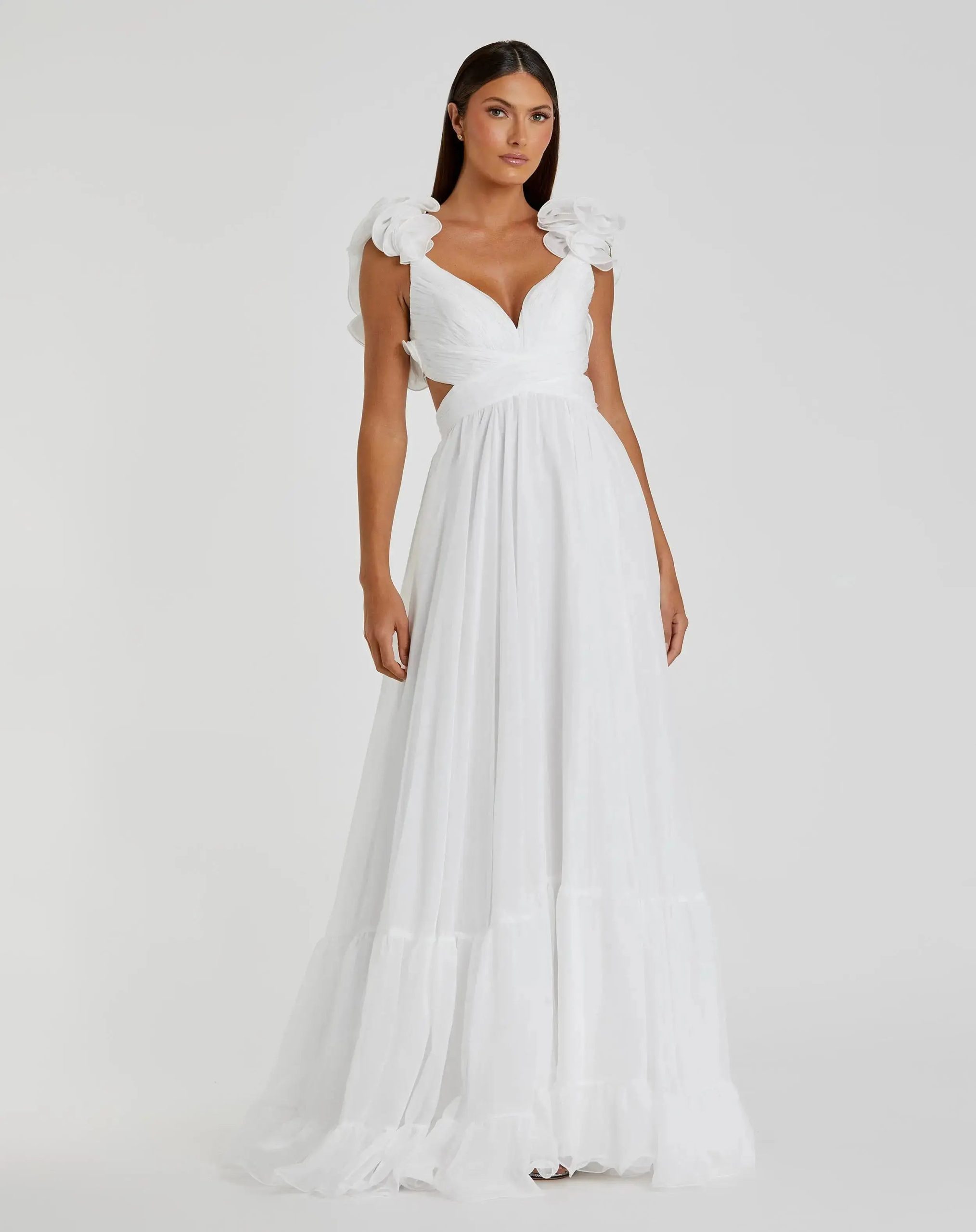 The Mac Duggal Iconic Ruffle Gown. Floor length tiered gown with daring side cutouts, a lace-up back, and dramatic ruffles at the shoulder. This best selling silhouette is flattering on most body types and easily adjustable for the best fit.