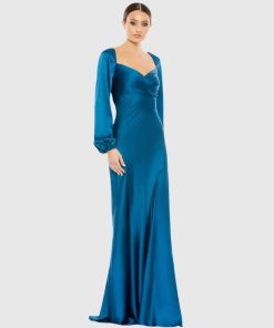 Mac Duggal Women’s Wedding Blue Floral Applique Long Sleeve Illusion Gown | Blue