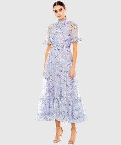 Mac Duggal Women’s Wedding Purple Floral Print High Neck Raglan Sleeve Dress | Purple