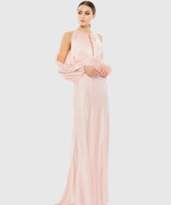 Mac Duggal Women’s Wedding Pink Tied Keyhole Cold Shoulder Bishop Sleeve Gown | Pink