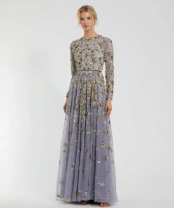 Mac Duggal Women’s Wedding Platinum Embellished High Neck Long Sleeve A Line Gown | Platinum Gold