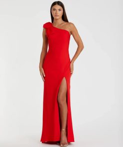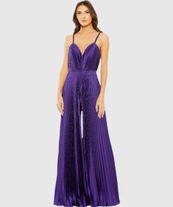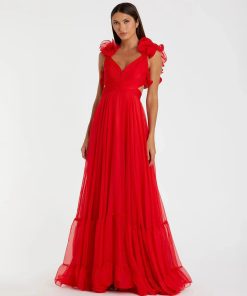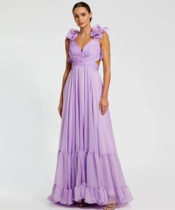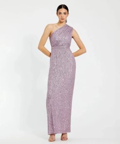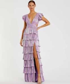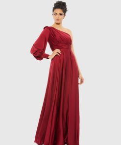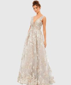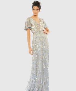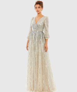 Mac Duggal Women’s Wedding Silver Sequined Plunge Neck Structured Bishop Sleeve Gown