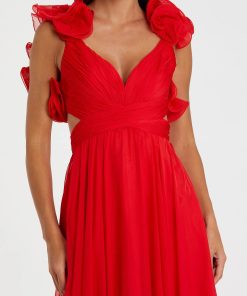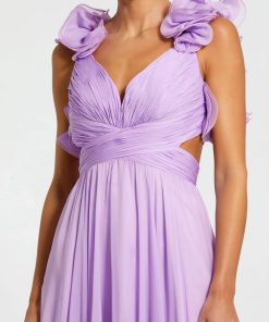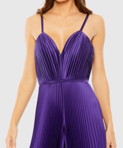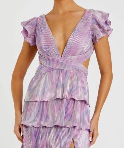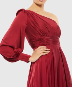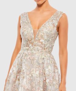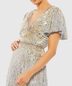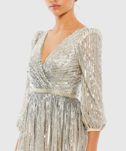 Mac Duggal Women’s Wedding Silver Sequined Plunge Neck Structured Bishop Sleeve Gown