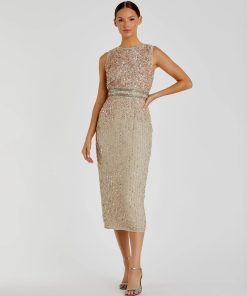 Mac Duggal Women’s Wedding Sleeveless High Neck Beaded Midi Sheath Dress