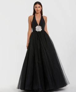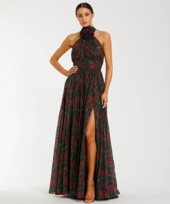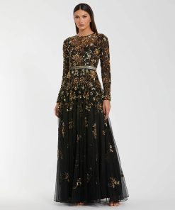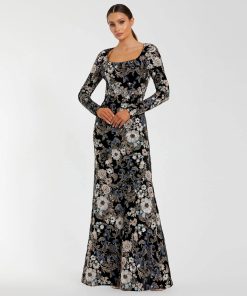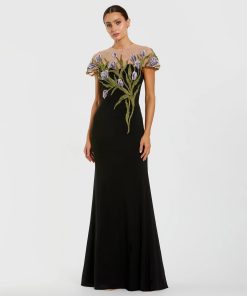 Mac Duggal Women’s Dresses Black Floral Beaded Mesh Scoop Neck Sleeveless Gown | Black Multi